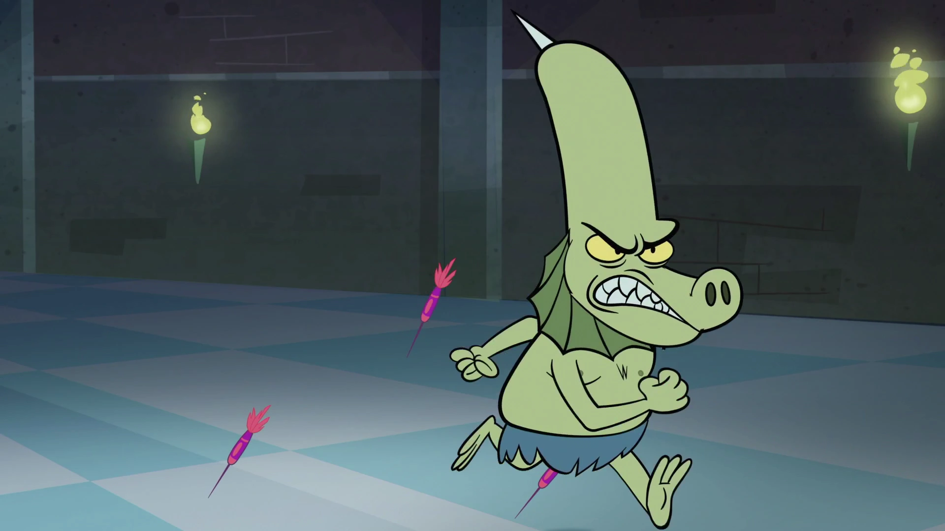 Potwór ma zieloną skórę, żółte oczy i pysk krokodyla. Jego czoło jest wysokie, zakończone kolcem. Nosi na biodrach niebieską przepaskę.